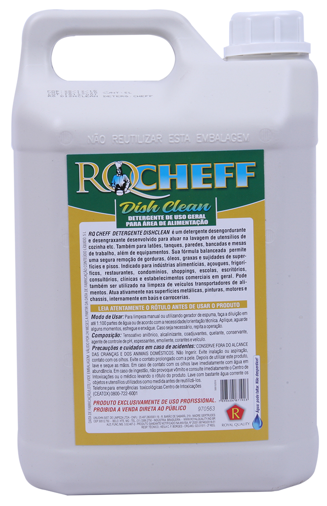 O RQ Detergente DishClean é um detergente desengordurante desengraxante desenvolvido para atuar na lavagem manual de louças, talheres e utensílios de cozinha. Também para latões, tanques, paredes, bancadas e mesas de trabalho, além de equipamentos.
