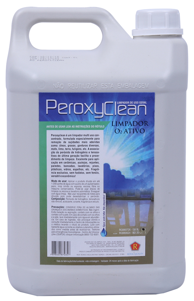 RQ PeroxyClean é um limpador multiuso concentrado, formulado especialmente para remoção de sujidades mais aderidas como óleos, gorduras diversas, mofo, limo, terra, fuligens, etc. A associação do peróxido de hidrogênio e tensoativos de última geração facilita o procedimento de limpeza. Excelente para aplicação em cerâmicas, azulejos, rejuntes, paredes, bancadas, lavatórios, pisos, plásticos, vidros, espelhos, etc. Fragrância exclusiva, sem fosfatos, sem fenóis, versátil e econômico.