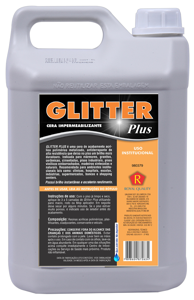 Glitter Plus é um acabamento acrílico polimérico metalizado, antiderrapante, de alta resistência, idealizado para ser utilizado em pisos laváveis, tais como: mármore, granitos, cerâmicas, cimentados, pisos industriais, pisos vinílicos emborrachados, madeira sintecada e madeira natural. Especialmente formulada para uso em locais de tráfego intenso. Recomendado para ambientes institucionais tais como: clínicas, hospitais, escolas, indústrias, supermercados, bancos e shopping centers. Possui brilho instantâneo e excelente rendimento.